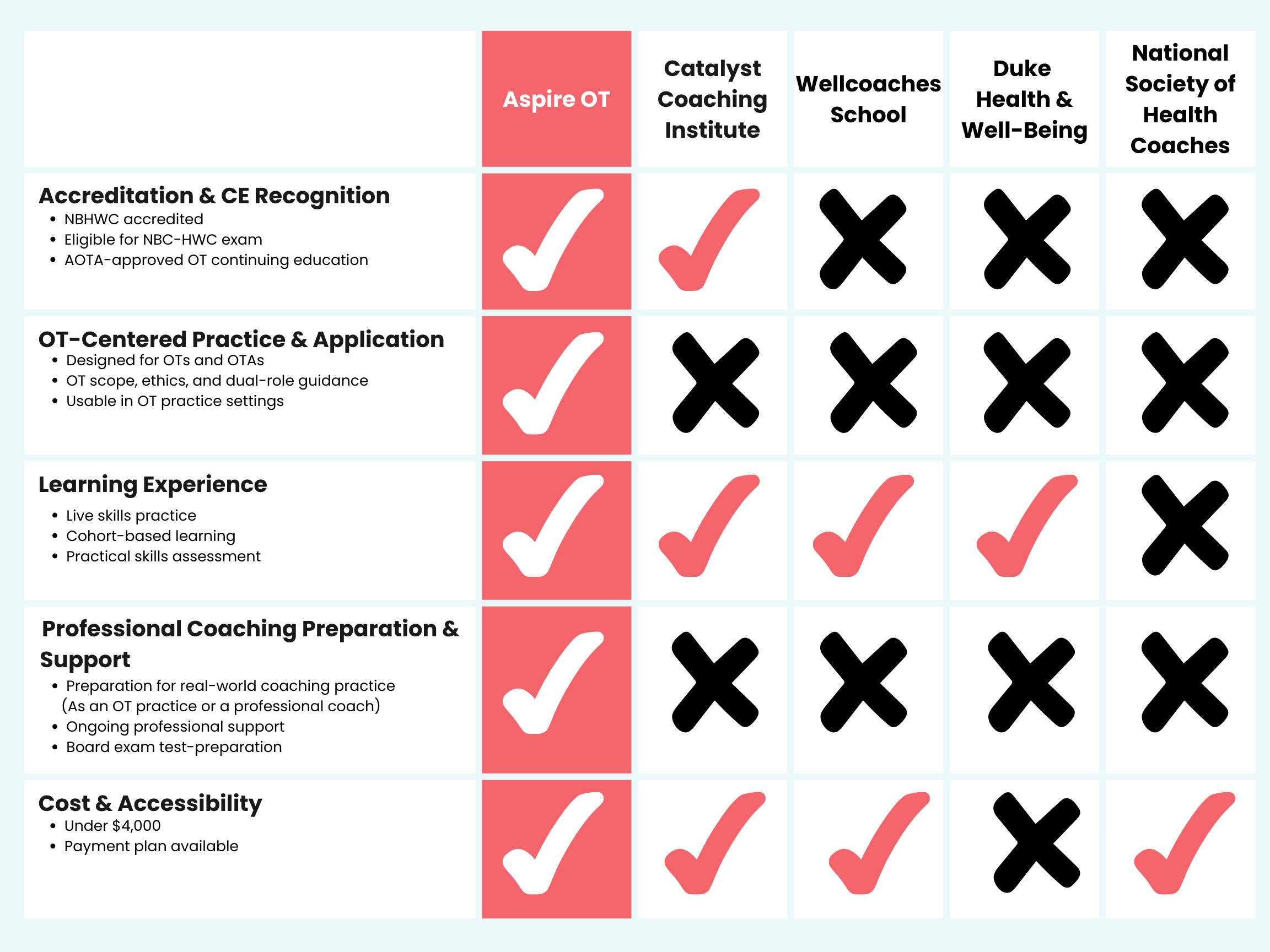Just for OT: Practitioner to Coach Program at Aspire OT is an Approved Health and Wellness Coach Training & Education Program by the National Board for Health and Wellness Coaching (NBHWC). Graduates of this program are eligible to apply for the HWC Certifying Examination to become a National Board Certified Health & Wellness Coach (NBC-HWC).